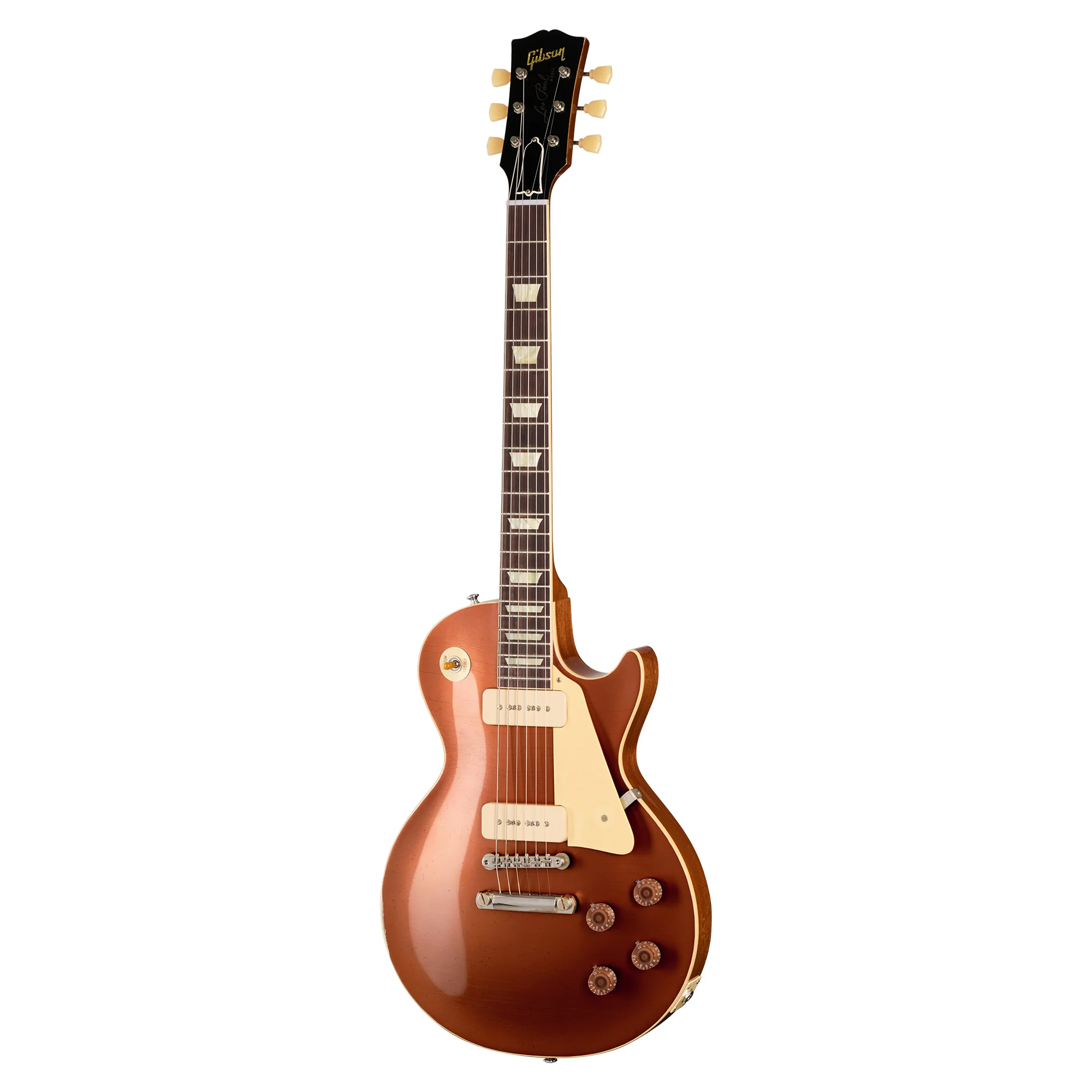 The National Association of Music Merchants (NAMM) is a not-for-profit global trade association dedicated to the music products industry. Their annual trade shows are major events in the musical products industry and go all the way back to 1902, when the first one occurred in Baltimore, MD. Companies like Gibson regularly display new models at the NAMM Show to introduce them to dealers, the press, and other show visitors. They also occasionally display unique models specifically made for the NAMM Show. Gibson displayed five distinctive Les Paul ™ models at the 1955 NAMM Show, which was held in Chicago, IL, that year, with each guitar finished in one of five custom metallic nitrocellulose lacquer car finishes—Samoa Beige, Copper Iridescent, Nugget Gold, Platinum, and Viceroy Brown. In addition to their custom metallic finishes, they were outfitted with no-wire ABR-1 Tune-O-Matic™ bridges and Stop Bar tailpieces. These bridges were first introduced on the Gibson Super 400 in 1953 and were used on the 1954 Les Paul Custom, but they made their first appearance on a standard Les Paul model with the five guitars that were displayed at the 1955 NAMM Show. These distinctive-looking and historically notable Les Pauls were made in extremely limited numbers, and the whereabouts of only a few are known today.
