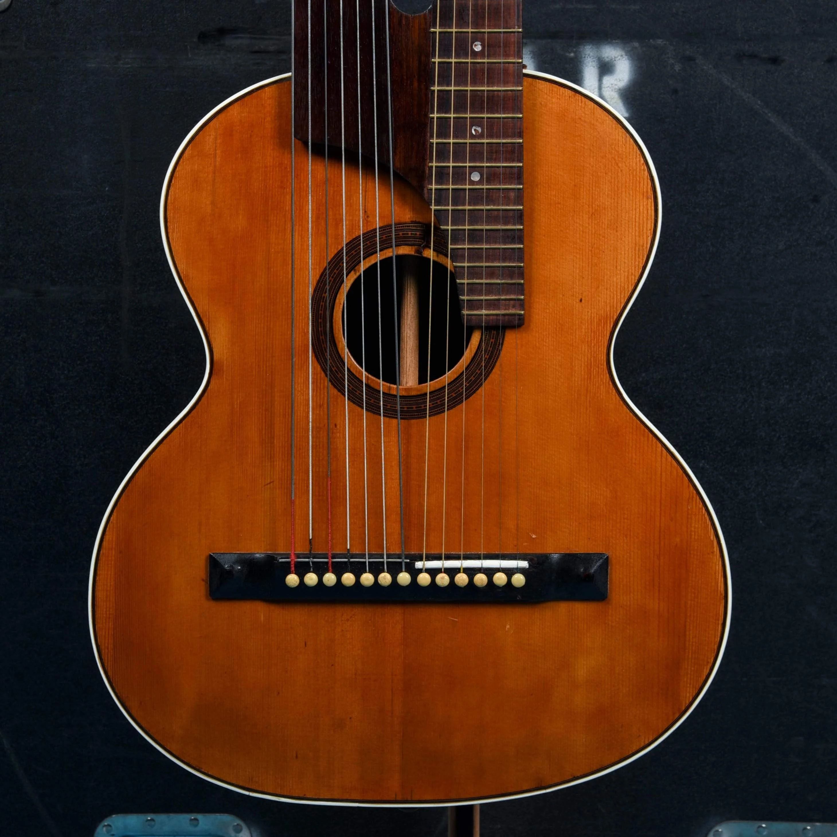 Cosmetic Condition: This instrument has a fair amount of wear and aging. There are scratches, dings, and chips throughout. The finish is worn throughout and there is a blemish at the top of the soundhole.